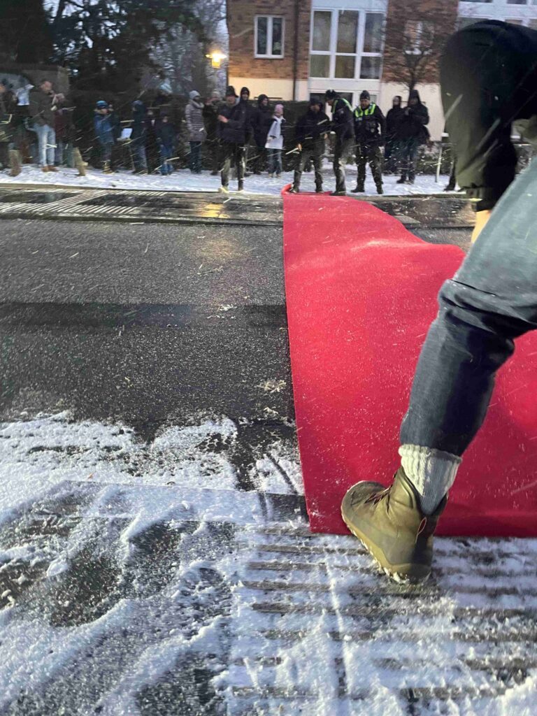Unter dem Motto #roterTeppichfuerKinder rollten wir einen langen roten Teppich quer über die Straße – nicht für Stars, sondern für die wahren VIPs: unsere Kinder auf ihrem täglichen Schulweg. Mit großartiger Unterstützung der Polizei, die den Verkehr für uns immer wieder kurz stoppte und so für einen ordentlichen Stau sorgte, haben wir gezeigt, was uns wichtig ist.