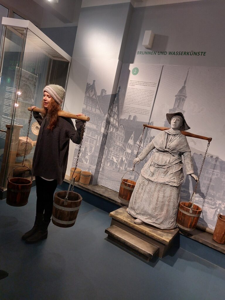 Dass Hamburg die erste deutsche Stadt mit einer kommunalen Wasserwirtschaft war und Lieferando und Co eigentlich von den starken Wasserträgerinnen Hamburgs erfunden wurde, das größte deutsche Klärwerk im Hamburger Hafen steht und absolut energieautark bewirtschaftet wird, Mais vom Menschen nicht verdaut werden kann und Ratten in der Toilette keine Seltenheit sind, Abwasserrohre in Hamburgs Untergrund so groß sind, dass man darin sogar tanzen kann und Wassereimer aus Leder langlebiger als Plastikeimer, erfuhren wir sehr anschaulich bei einer Exkursion zu den Hamburger Wasserwerken. Begriffe wie Klappe und Schieber, Hydrant und Trenn- und Mischsystem oder Faulturm hörten wir wieder und ergeben nun neu Sinn für uns. Und selbst, wenn der Gestank im Klärwerk durch biologische und chemische Wasseraufbereitung kaum auszuhalten ist, kamen wir doch aus dem Staunen ob der riesigen Dimensionen der Hamburger Wasserwerke und ihrem Beitrag zu einer nachhaltigen und klimaneutralen Stadt nicht heraus.