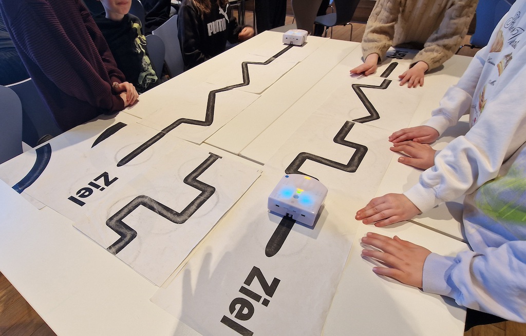 Wenn man Thymio zu sehr in die Enge drängt, quittiert er dies mit einem mürrischen Geräusch – eine wunderbare Gelegenheit für die Schüler:innen, die Grenzen von Aktion und Reaktion spielerisch und reflektiert zu erforschen. Ob er nun auf Klatschen reagierte oder geduldig einem vorgegebenen Pfad folgte – die Kinder lernten, dass Programmierung absolute Präsenz und Konzentration erfordert.